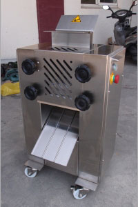 6、確認旋轉方向正確后,把帶筋膜的肉,皮朝下放在刀片上,輕踩腳踏板把肉往前推即可。